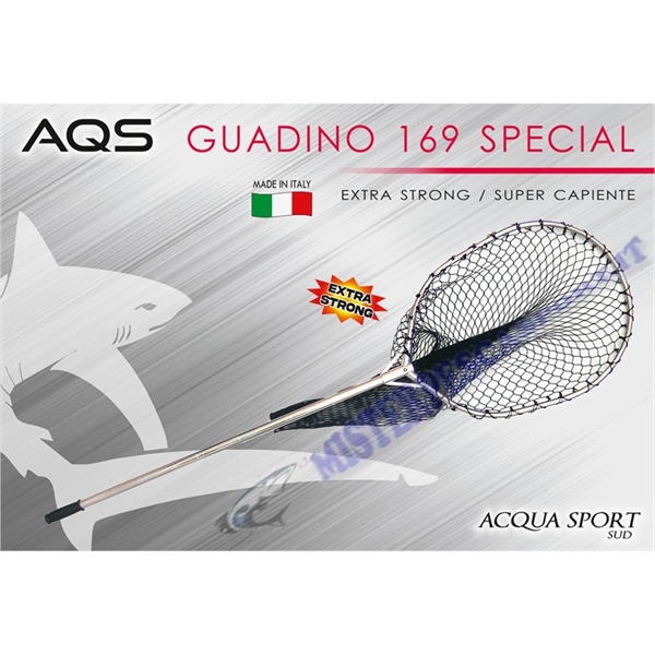 Guadino da barca rinforzato con tubolari in allumino Extra Strong. Extra robusto e sicuro per prede importanti pescando dalla barca al palangaro, bolentino o traina. La testa si blocca sul manico grazie all'incastro del pulsante sul manico. Maglia larga e rete capiente.